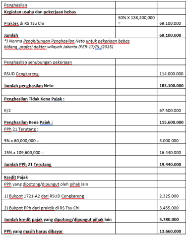 1. Dalam hal Wajib Pajak hanya bekerja sebagai dokter dengan status pegawai tetap di rumah sakit/ klinik dan tidak memperoleh penghasilan dari pasien serta telah dipotong PPh Pasal 21, maka penghasilan neto adalah penghasilan dari pekerjaan seperti gaji, honorarium, dikurangi dengan biaya jabatan, iuran Jaminan Hari Tua, dsb.;