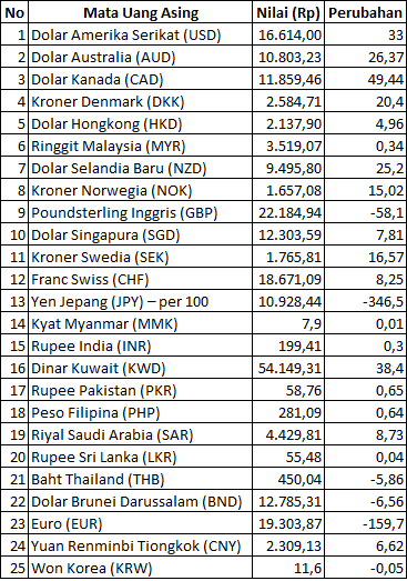 Mata uang yang melemah terhadap Rupiah: Yen Jepang, Euro, Poundsterling Inggris, Baht Thailand, dan Dolar Brunei.