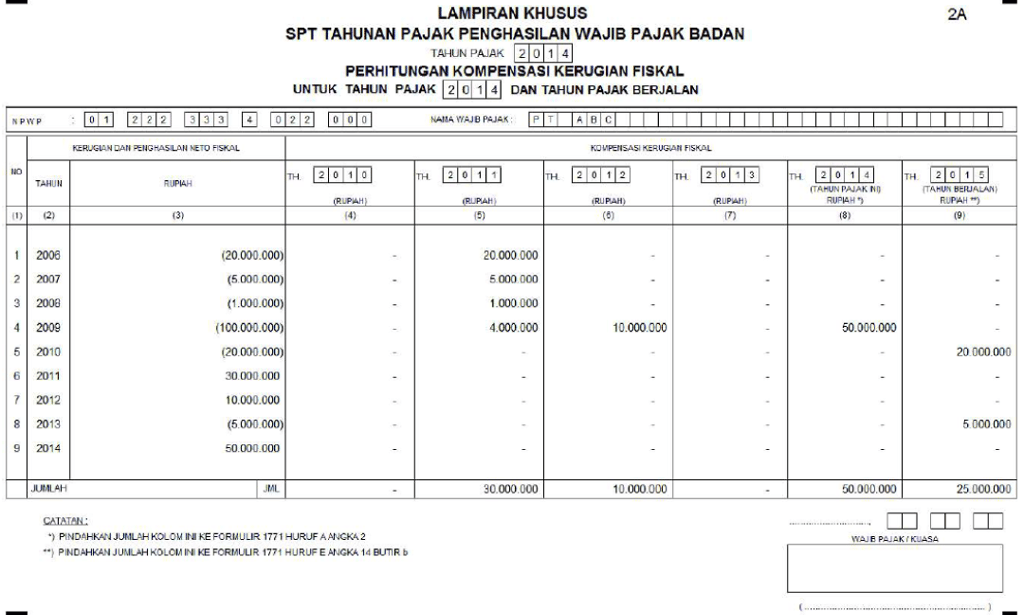 Lampiran khusus 2A berisi perhitungan kompensasi kerugian fiskal yang dialami oleh wajib pajak badan usaha. Kompensasi kerugian fiskal ini maksudnya jika diakhir tahun masa pajak wajib pajak badan usaha mengalami kerugian maka kerugian tersebut dapat dikompensasikan selama 5 tahun. Tapi perhitungan kompensasi kerugian fiskal ini hanya berlaku untuk kerugian fiskal dari kegiatan usaha di Indonesia saja, tidak termasuk kerugian fiskal dari kegiatan usaha di luar negeri baik melalui bentuk usaha tetap (BUT) ataupun bukan BUT.