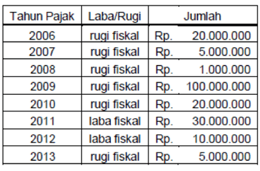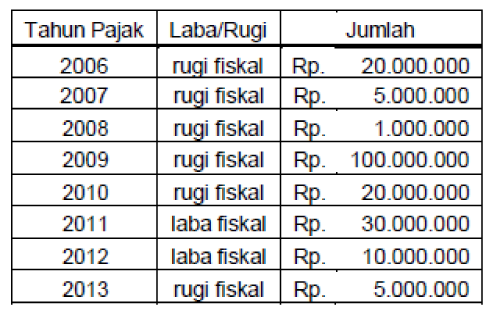 PT ABC berdiri pada tahun 2006. Pada Tahun Pajak 2014 Wajib Pajak memperoleh laba fiskal sebesar Rp50.000.000,- dan tahun pajak 2015 memperoleh laba fiskal sebesar Rp25.000.000 Adapun keuntungan/kerugian fiskal tahun-tahun sebelumnya adalah sebagai berikut :