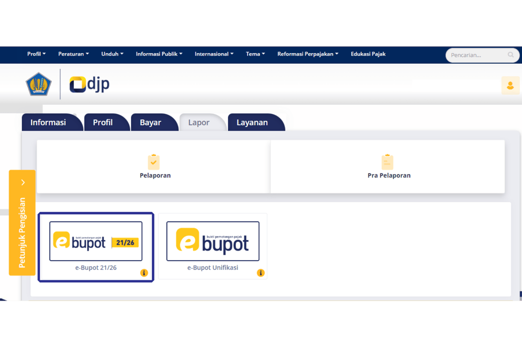 Seperti nama nya e-Bupot 21/26 mirip dengan e-Bupot 23/26 hanya yang dihitung adalah PPh Pasal 21/26. Aplikasi e-Bupot 21/26 merupakan aplikasi berbasis web, untuk menggunakannya wajib pajak dapat login melalui laman https://djponline.pajak.go.id.