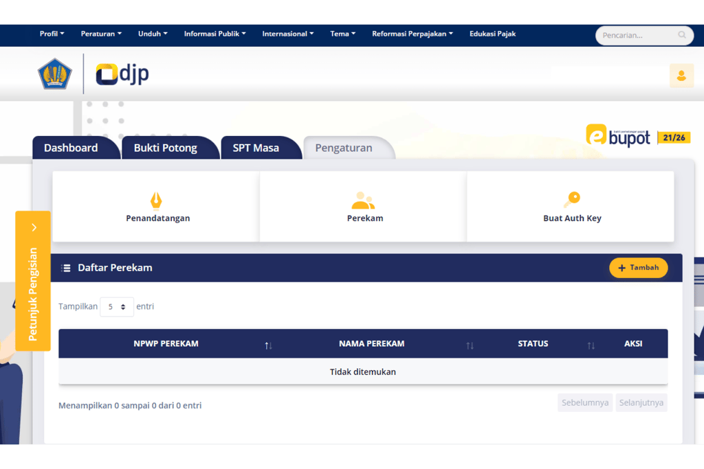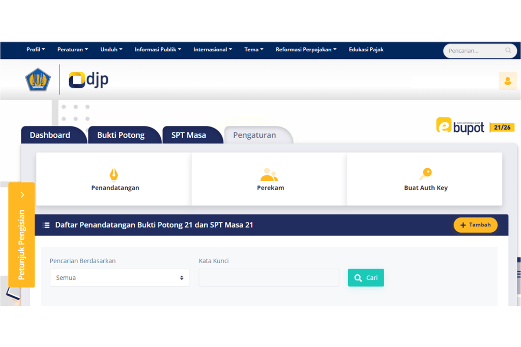 Mendaftarkan orang pribadi yang ditunjuk sebagai penandatangan bukti potong dan penandatangan Surat Pemberitahuan (SPT) Masa PPh Pasal 21/26.