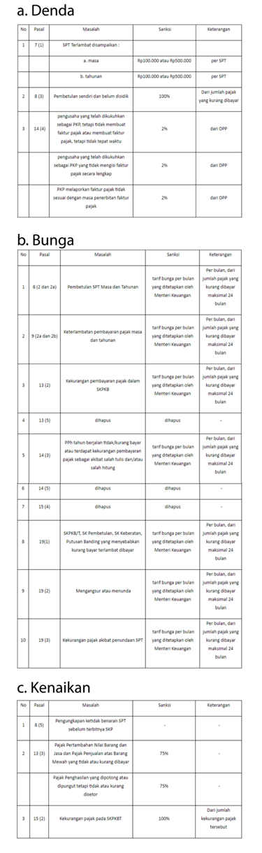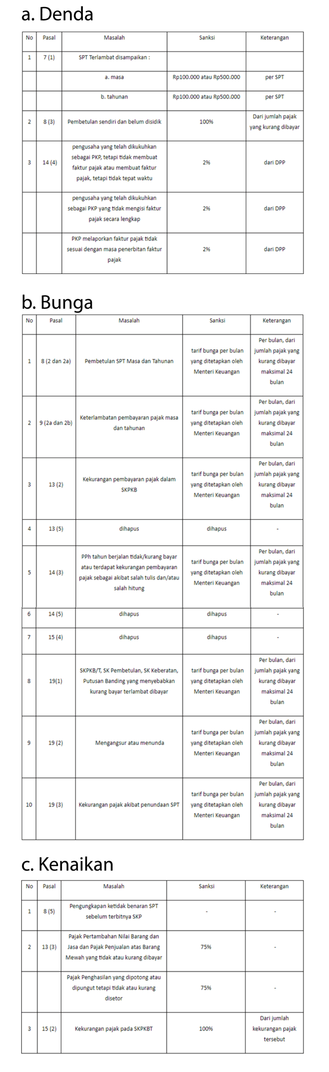 Berdasarkan hasil pemeriksaan yang dilakukan oleh Direktorat Jenderal Pajak, maka akan diterbitkan suatu surat ketetapan pajak, yang dapat mengakibatkan pajak terutang menjadi kurang bayar, lebih bayar, atau nihil. Berdasarkan pemeriksaan, jenis-jenis ketetapan yag dikeluarkan adalah: Surat Ketetapan Pajak Lebih Bayar (SKPLB), Surat Ketetapan Pajak Kurang Bayar (SKPKB), Surat Ketetapan Pajak Kurang Bayar Tambahan (SKPKBT), dan Surat Ketetapan Pajak Nihil (SKPN). Disamping itu dapat diterbitkan pula Surat Tagihan Pajak (STP) dalam hal dikenakannya sanksi administrasi dapat berupa denda, bunga, dan kenaikan.Tabel sanksi administrasi yang ada dalam surat ketetapan pajak disajikan dalam uraian dibawah ini.