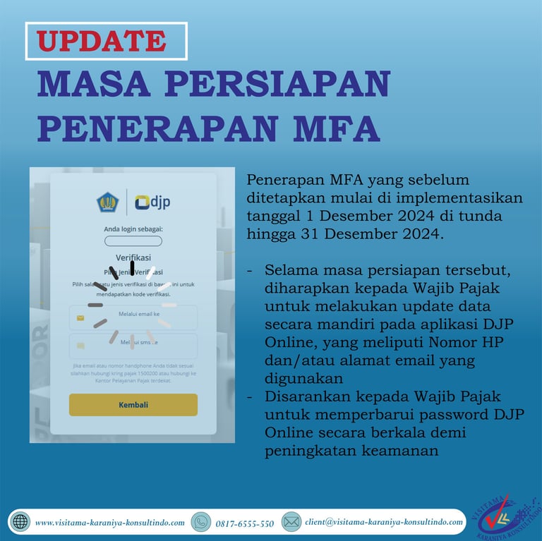Selama masa persiapan tersebut, diharapkan kepada Wajib Pajak untuk melakukan update data secara mandiri pada aplikasi DJP Online, yang meliputi Nomor HP dan/atau alamat email yang digunakan